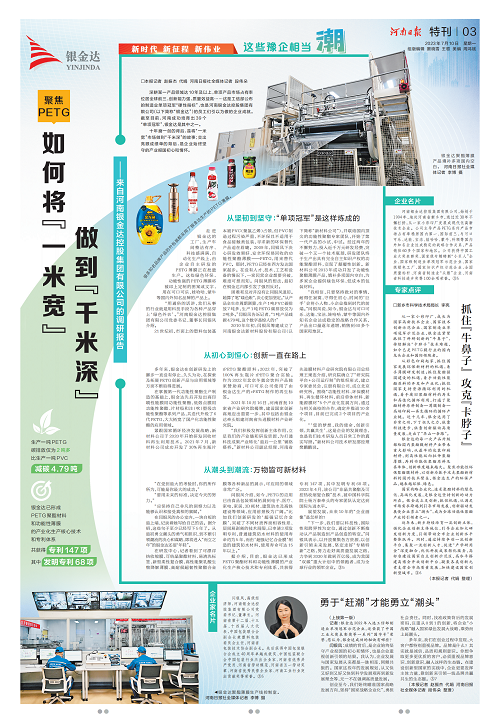 7月10日,《河南日报》联合《大河财立方》刊发银金达董事长闫银凤专题访谈《这些豫企相当潮丨河南银金达控股集团有限公司:如何将“一米宽”做到“千米深”》,聚焦银金达创新驱动潮流涌动的发展态势,新乡市科学技术局李亮局长对银金达的创新驱动高质量发展之路给予高度评价。全文如下: